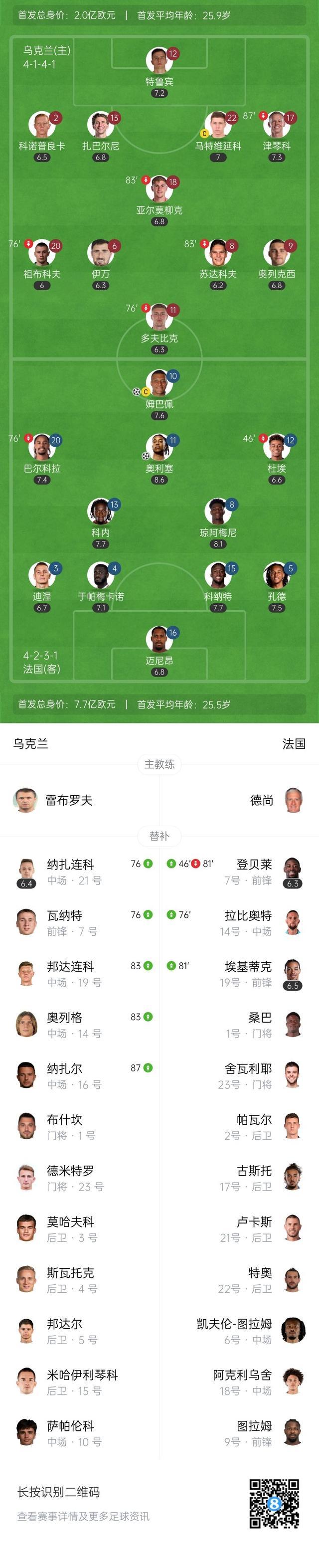 直播吧9月6日讯 世预赛欧洲区小组赛D组第5轮,乌克兰坐镇弗洛茨瓦拉夫市立球场迎战法国。上半场,巴尔科拉助攻奥利塞破门。易边再战,扎巴尔尼中柱,巴尔科拉失单刀,登贝莱替补登场后伤退,姆巴佩破门。最终乌克兰0-2法国。积分榜方面,法国收获开门红,乌克兰首轮输球。